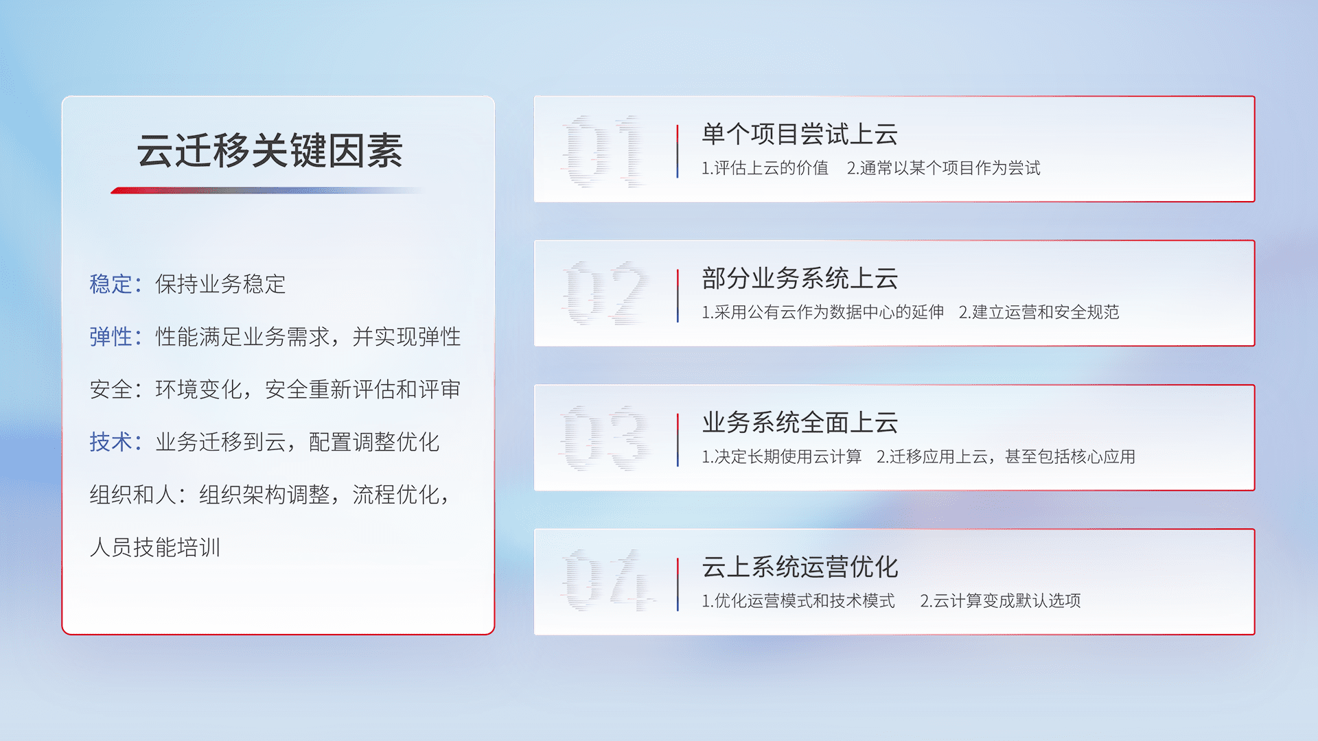结合实际业务,,,,从规划设计、、、、云平台选型、、、云原生改造、、数据迁移、、、集成交付,,,迁移全过程为客户识别最佳上云路径,,,,做好风险识别管理,,设计网络架构、、身份权限、、安全审计合规、、操作审计、、、日志审计、、、、监控告警策略、、、多站点容灾设计等,,对云上基础设施进行整体规划,,提升IT治理水平,,,,以满足弹性、、高可用、、、高性能的需求。。。