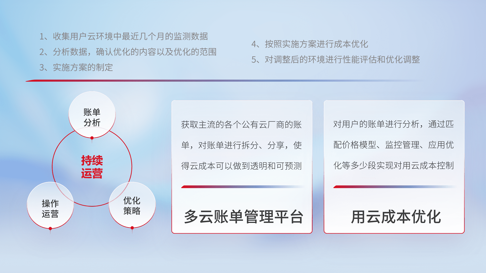 通过多云纳管,,,,以统一的资源数据模型把客户的云资源进行抽象和封装,,,,进而实现对多云资源的统一操作,,,保障云资源管理的可靠性、、、稳定性与可用性。。。。量身定制化运维内容,,配置、、开发运维、、、、补丁管理、、、备份、、监控、、认证和访问管理、、、、审计和日常巡检等,,,,保障在用云过程中的可靠度,,,稳定度以及高可用率。。
